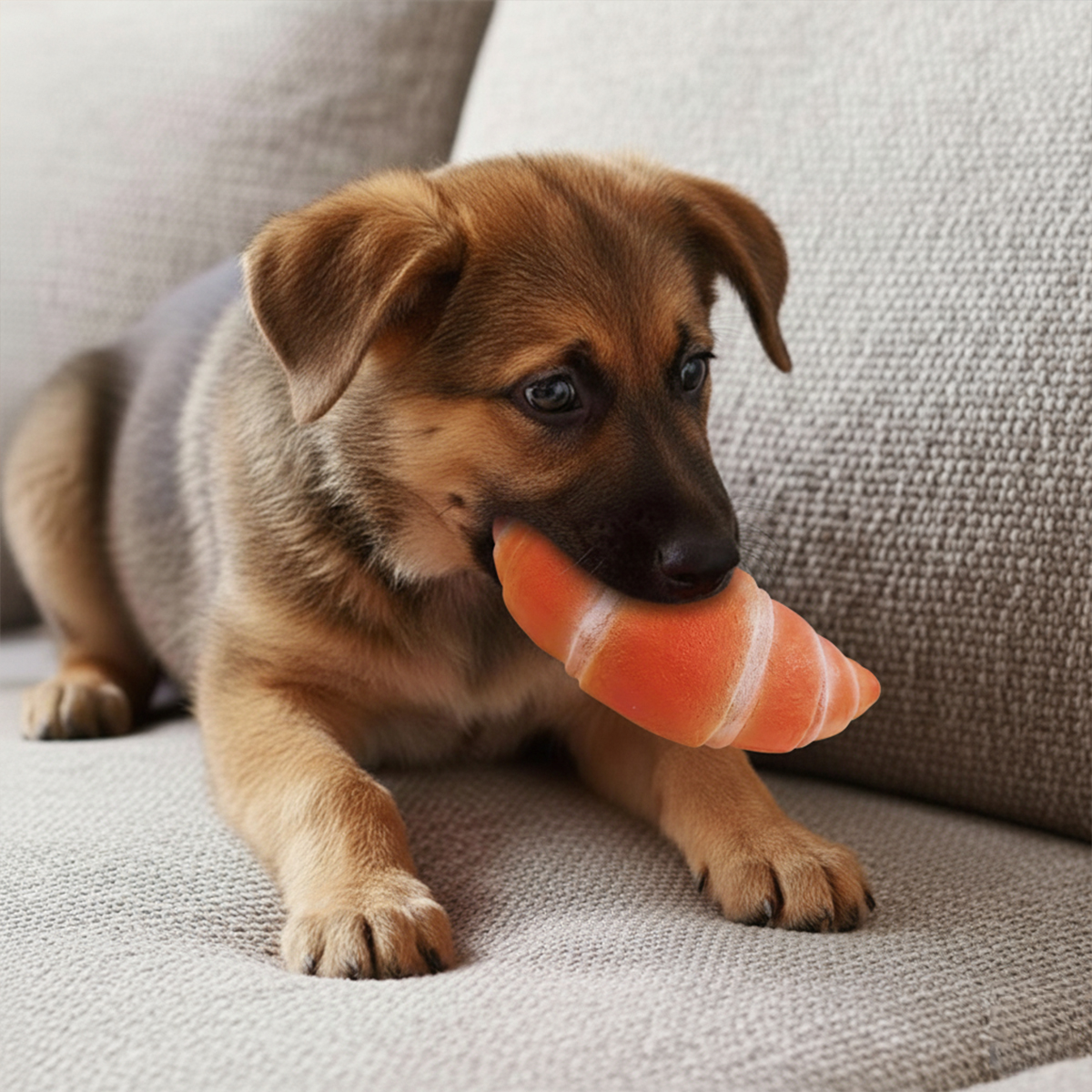 Jouet en latex souple en forme de croissant, idéal pour les chiots. Texture douce pour les dents sensibles, stimule le jeu et l’éveil tout en favorisant une mastication sûre. Parfait pour les premières phases de jeu.