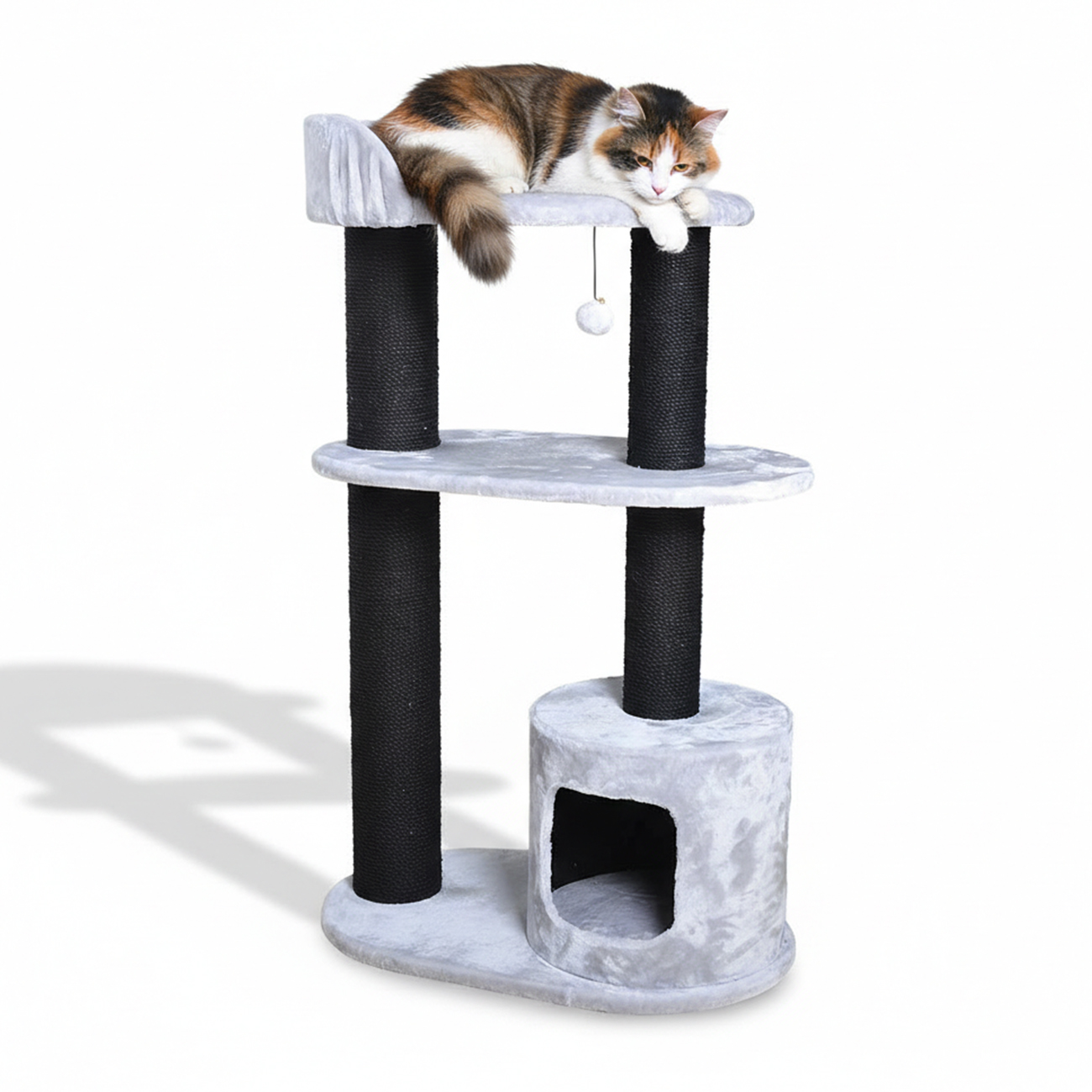 Arbre à chat Bedford avec abri et étages EBI conçu pour le chat. Il permet de griffer, se cacher et se reposer en hauteur, tout en offrant une structure stable et confortable. Idéal pour enrichir l’environnement du chat, stimuler son activité naturel