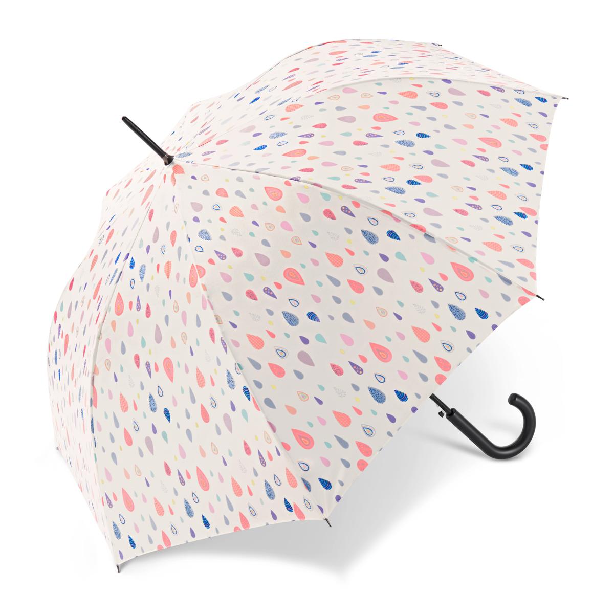 Mesdames et messieurs, voici un ravissant parapluie arborant un charmant motif de gouttes de pluie, avec des teintes pastel de rose, bleu et violet sur un fond crème doux.