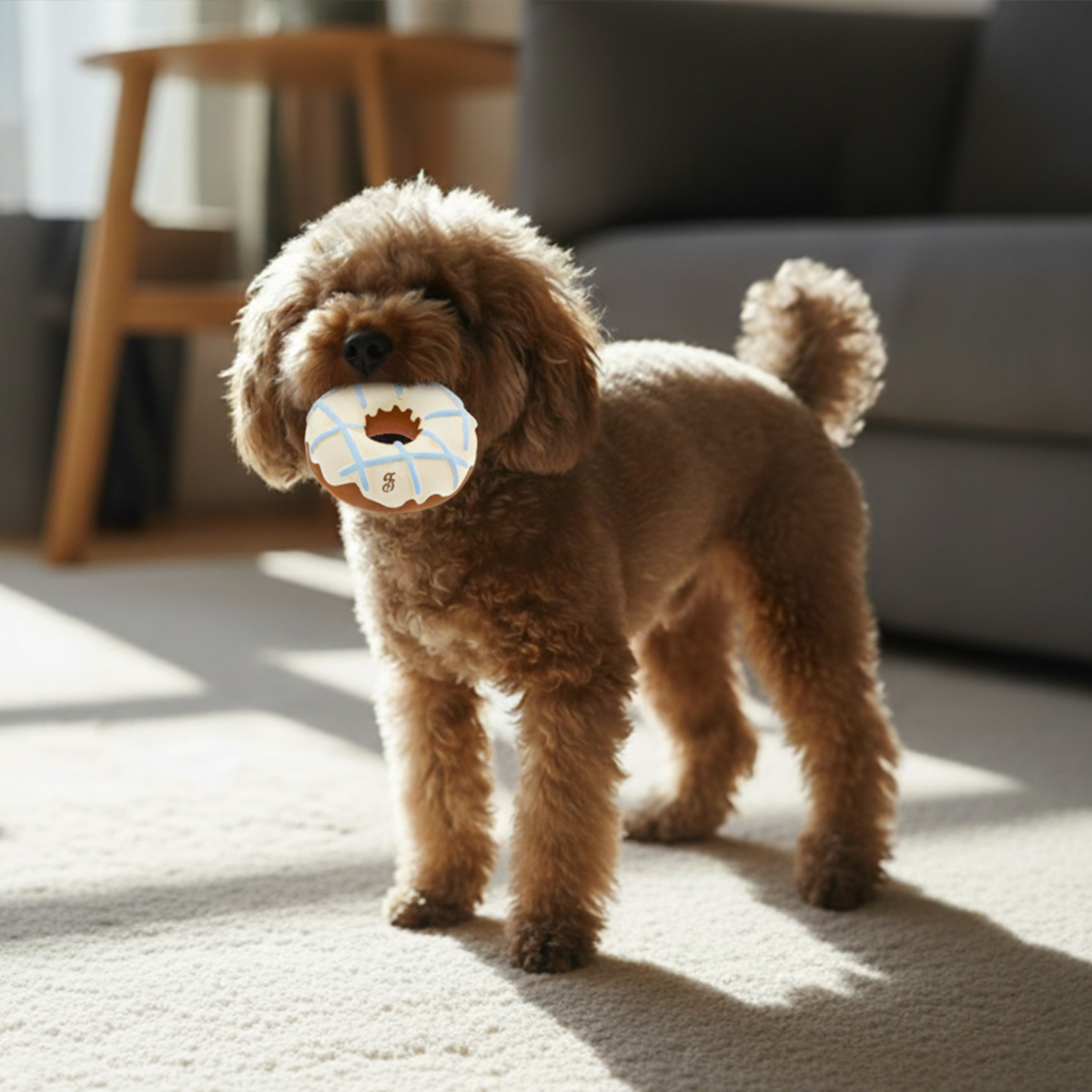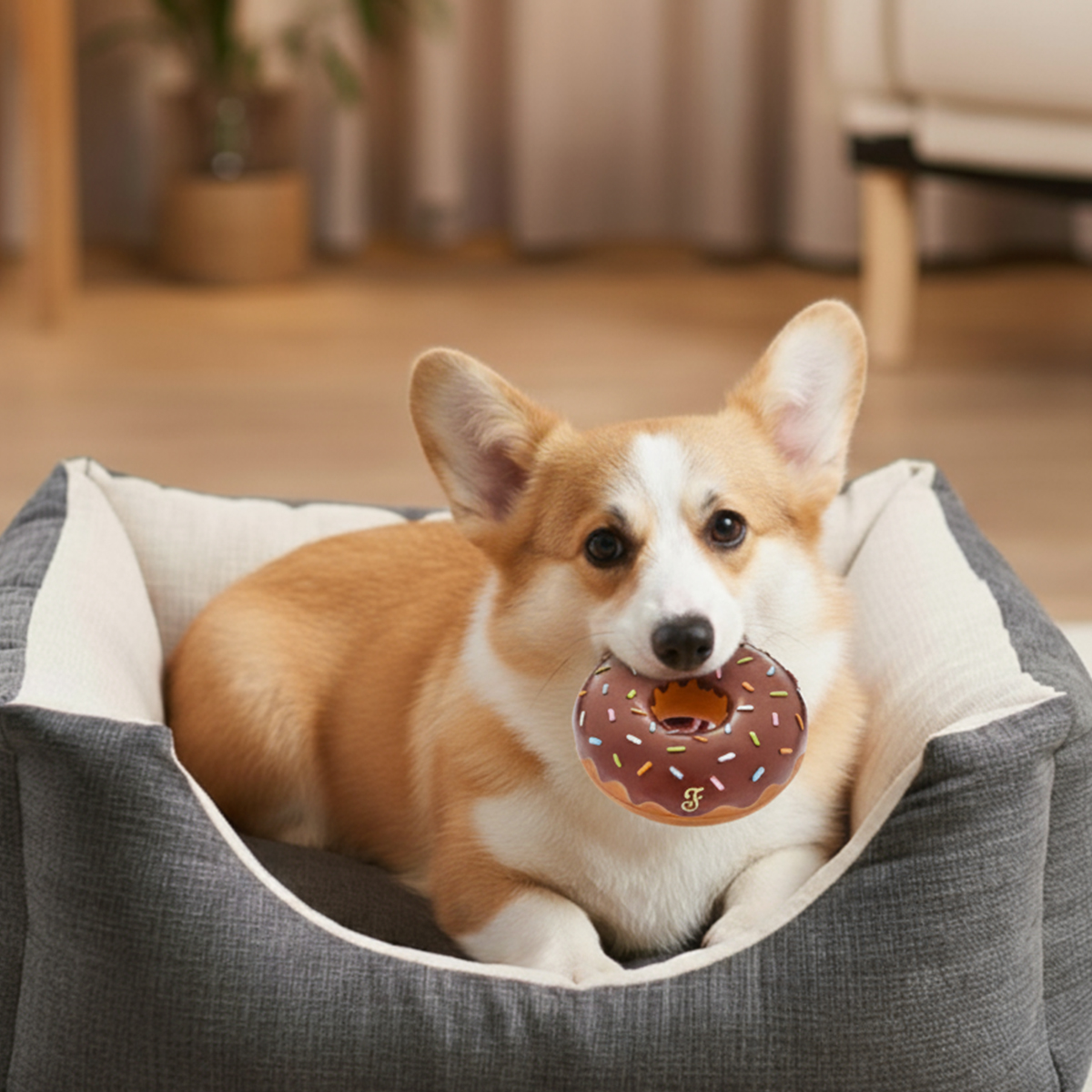 Jouets en forme de donuts en latex Ferribiella, conçus pour stimuler le jeu et la mastication. Texture douce, formes amusantes et couleurs vives pour occuper le chien tout en douceur. Diamètre 11 cm.