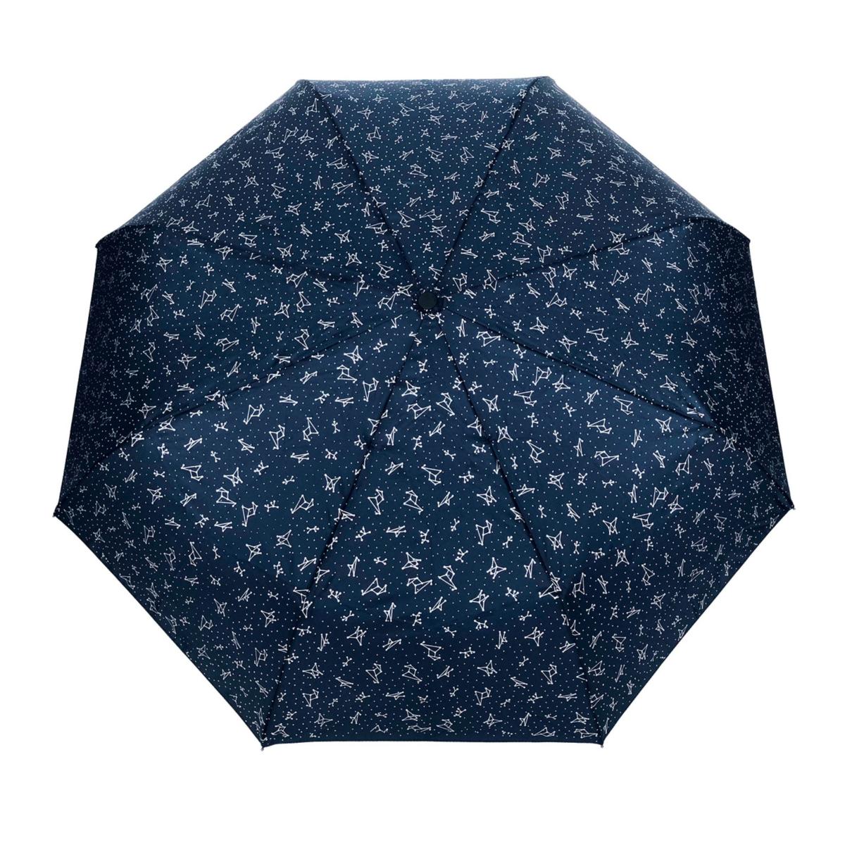 Ce parapluie est doté d'un auvent bleu avec un imprimé de constellations dorées.
