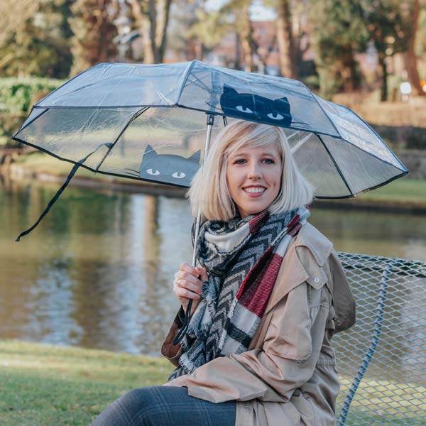 Ce parapluie pliant transparent imprimé chat vous permettra de profiter du panorama tout en étant parfaitement protégée.